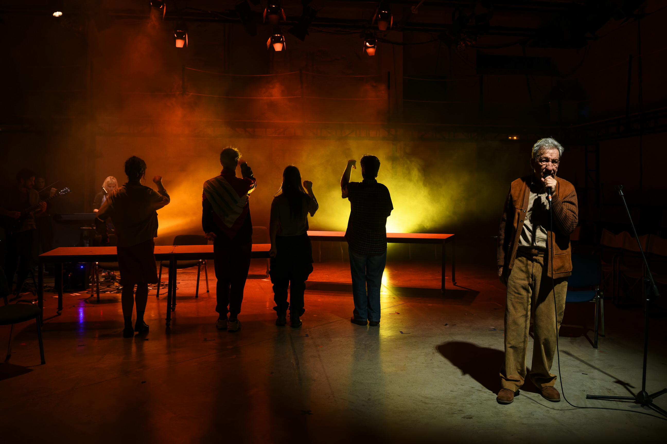 The actors change roles in an attempt to interpret what we are living through. They become opponents in a debate, members of political organisations, a mother and daughter, and an assembly. The situations and the people are on the verge of boiling point, waiting for the Apocalypse or perhaps for change. What is to be done?
